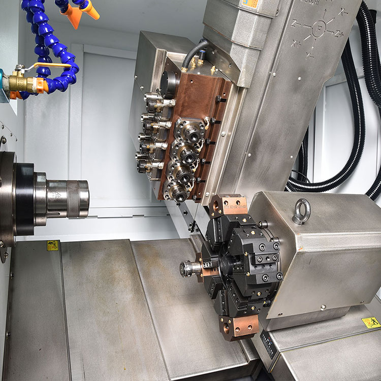 ★八工位(側(cè)向四工位+端向四工位)靜音強(qiáng)力型動(dòng)力頭,可在端面或側(cè)面進(jìn)行鉆、  銑、攻、雕等復(fù)雜加工,即可運(yùn)行五軸聯(lián)動(dòng)的復(fù)雜加工程式,Y軸軌道采用線性導(dǎo)軌結(jié)構(gòu),電機(jī)與絲杠經(jīng)直連組合,其精度高,換刀速度快。