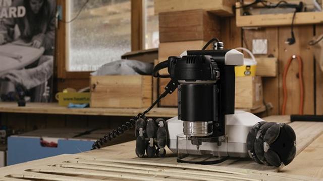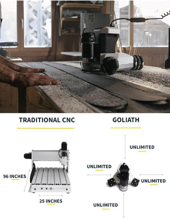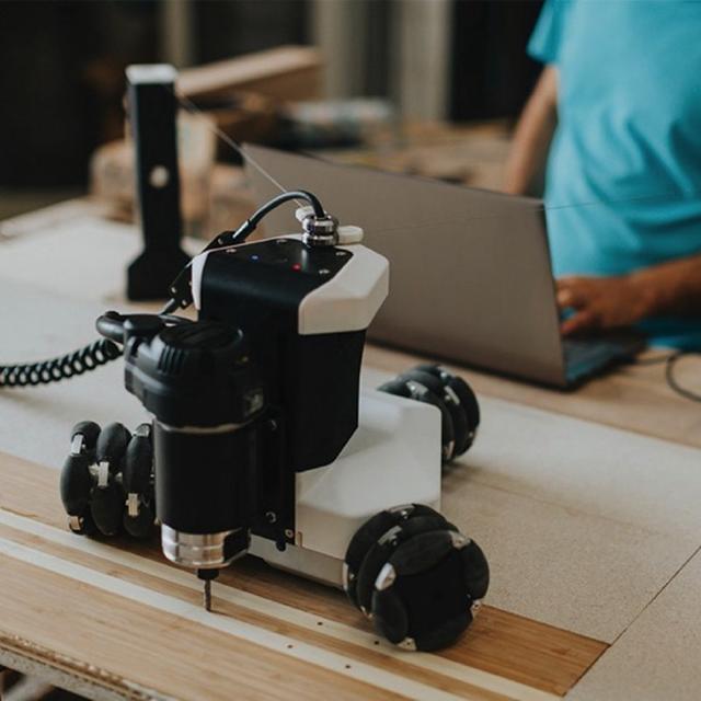 Goliath CNC 的三角形底座有三個(gè)萬向的輪子,看起來很像發(fā)福的可移動(dòng)電熨斗~ 不僅尺寸小、方便存儲(chǔ),它的自動(dòng)化程度還很高。Goliath 擁有專利的傳感器系統(tǒng)可以對(duì)機(jī)器人的位置進(jìn)行三角測(cè)量。通過射頻通訊使傳感器不斷更新其相對(duì)于工作區(qū)域的位置,頻率100次/秒,目標(biāo)位置精度誤差僅為0.1mm(0.004英寸)。