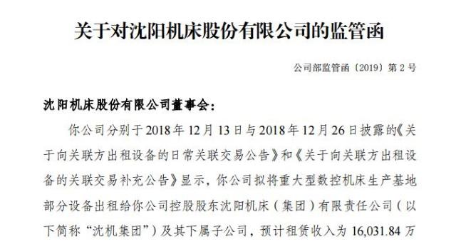 沈陽(yáng)機(jī)床分別于2018年12月13日與2018年12月26日披露《關(guān)于向關(guān)聯(lián)方出租設(shè)備的日常關(guān)聯(lián)交易公告》和《關(guān)于向關(guān)聯(lián)方出租設(shè)備的關(guān)聯(lián)交易補(bǔ)充公告》。