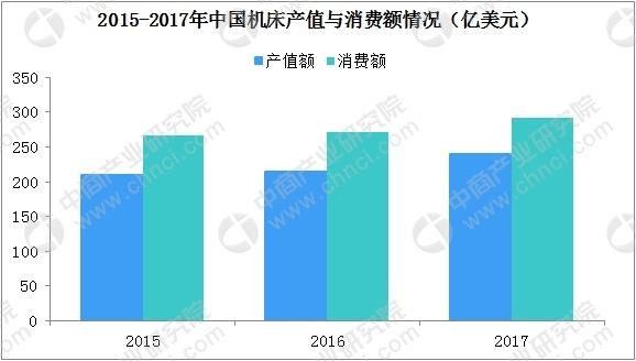 據(jù)數(shù)據(jù)統(tǒng)計(jì),2015-2017年,我國機(jī)床市場消費(fèi)總額分別為275億美元、275億美元、300億美元,我國機(jī)床產(chǎn)出總額分別為221億美元、229億美元、245億美元。經(jīng)歷了2016年機(jī)床市場企穩(wěn)后,2017年國內(nèi)機(jī)床行業(yè)受下游市場智能制造需求逐步向好。