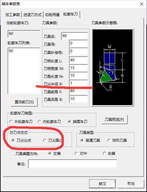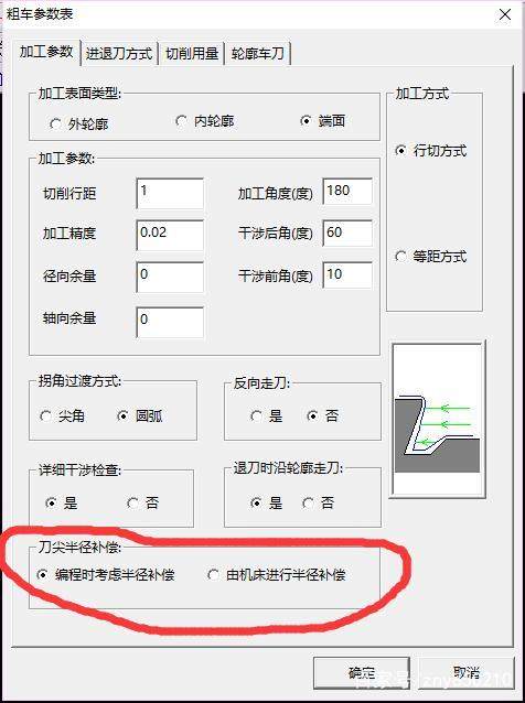在自動編程時,選用該功能表示刀尖的半徑為零,程序完全是按照工件的編程輪廓進行編程的,所生成的程序中帶有G42G41代碼,在加工中依據(jù)刀具的真實刀尖半徑由操作人員通過機床制定補償值。